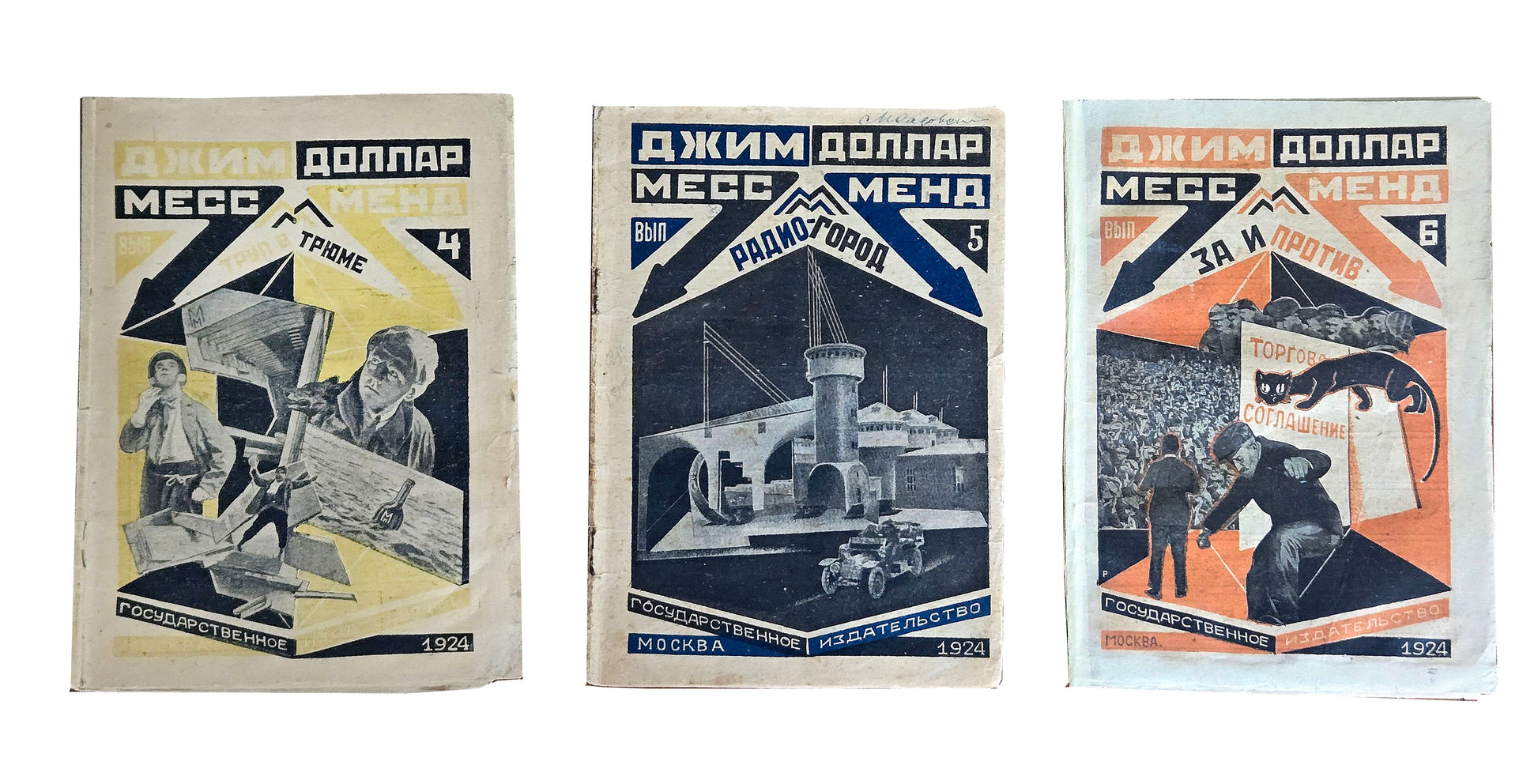 A rare complete set of this serialized detective novel with constructivist covers designed by Rodchenko. Written by Marietta Shaginyan under the pseudonym Jim Dollar, in essence, Mess Mend was the equivalent to American pulp magazines of the time. The major difference being the revolutionary messages embedded within its text.