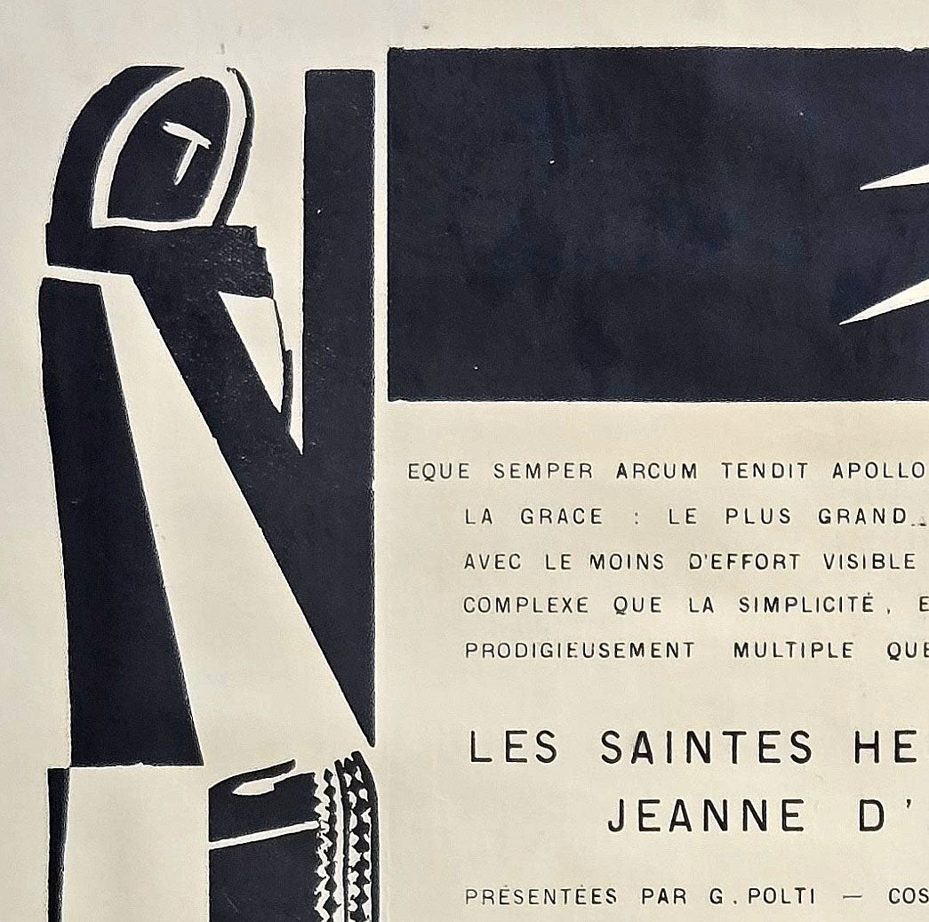 Les Saintes Heures de Jeanne D’Arc. Presentees par G. Polti... Woodcut and letterpress on paper designed by Claude Autant-Lara. Broadside, 508 x 359, backed on linen. [Paris: Art et Action, 1923].