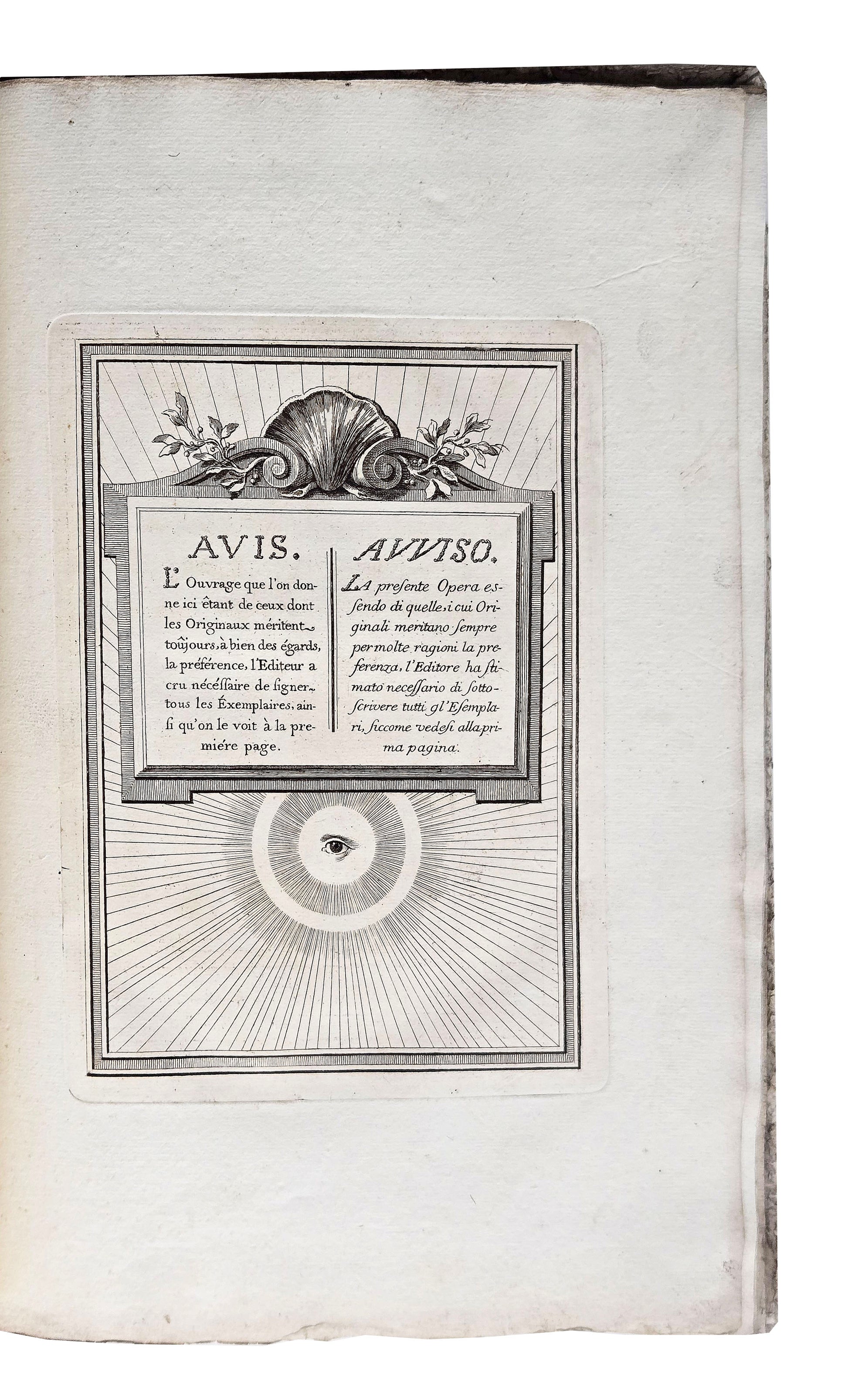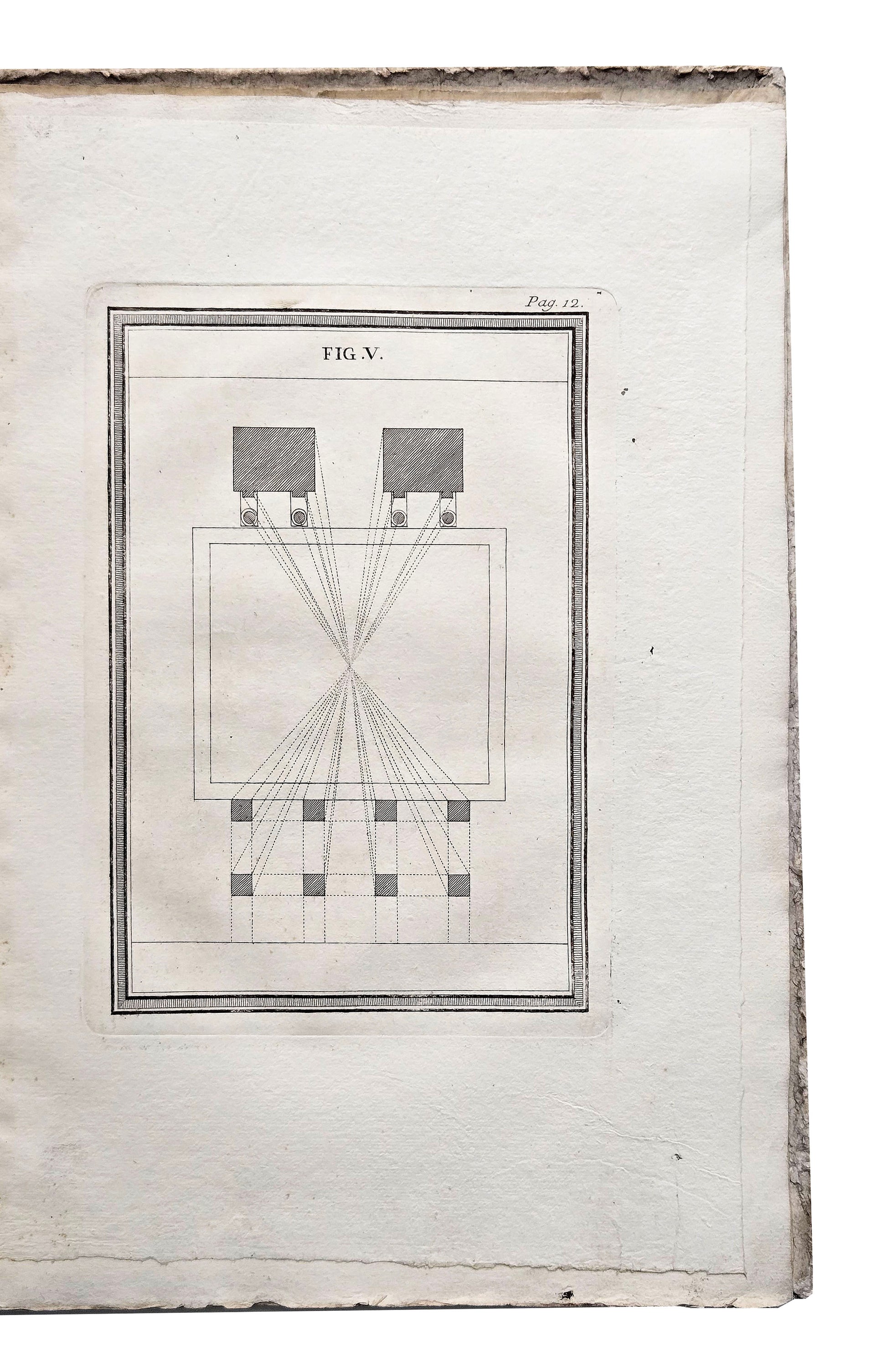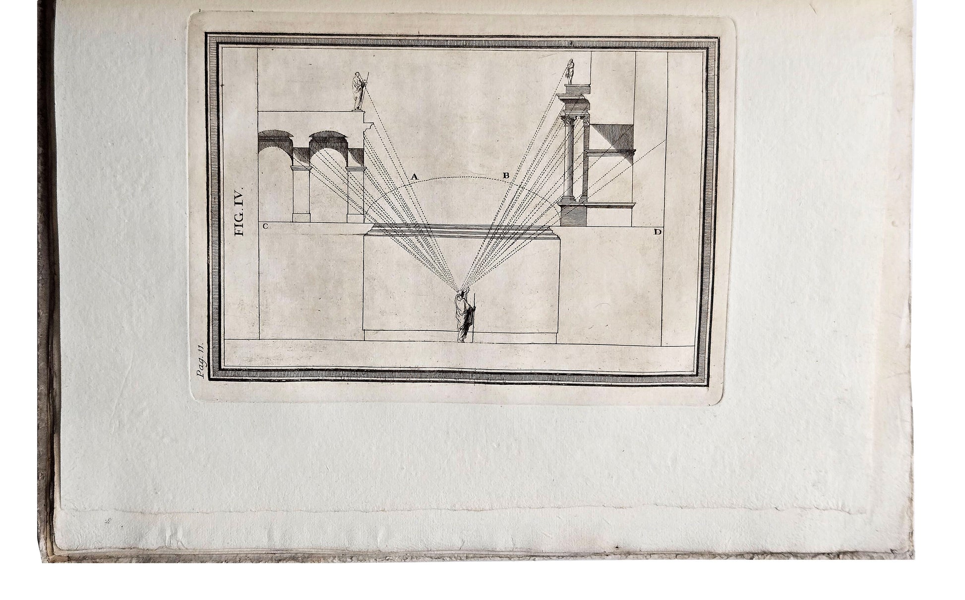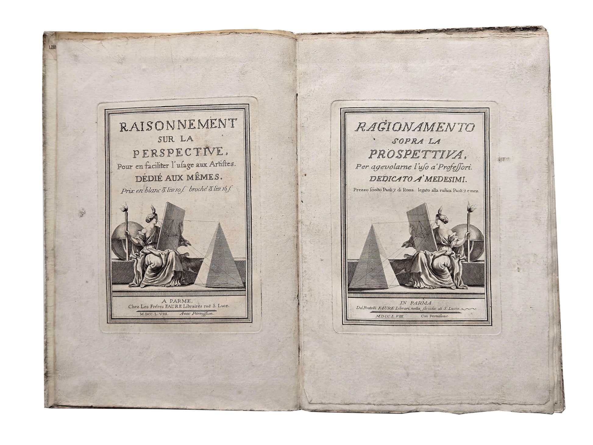 Raisonnement sur la Perspective: pour en faciliter l'Usage aux Artistes: dédié aux Mêmes. [10], 20 pp. Illustrated two engraved title-pages, engraved ‘notice’ and 9 full-page engraved plates. Folio, 360 x 250 mm, bound in contemporary paste-paper boards. A Parme: Chez les Freres Faure Libraires, 1758.