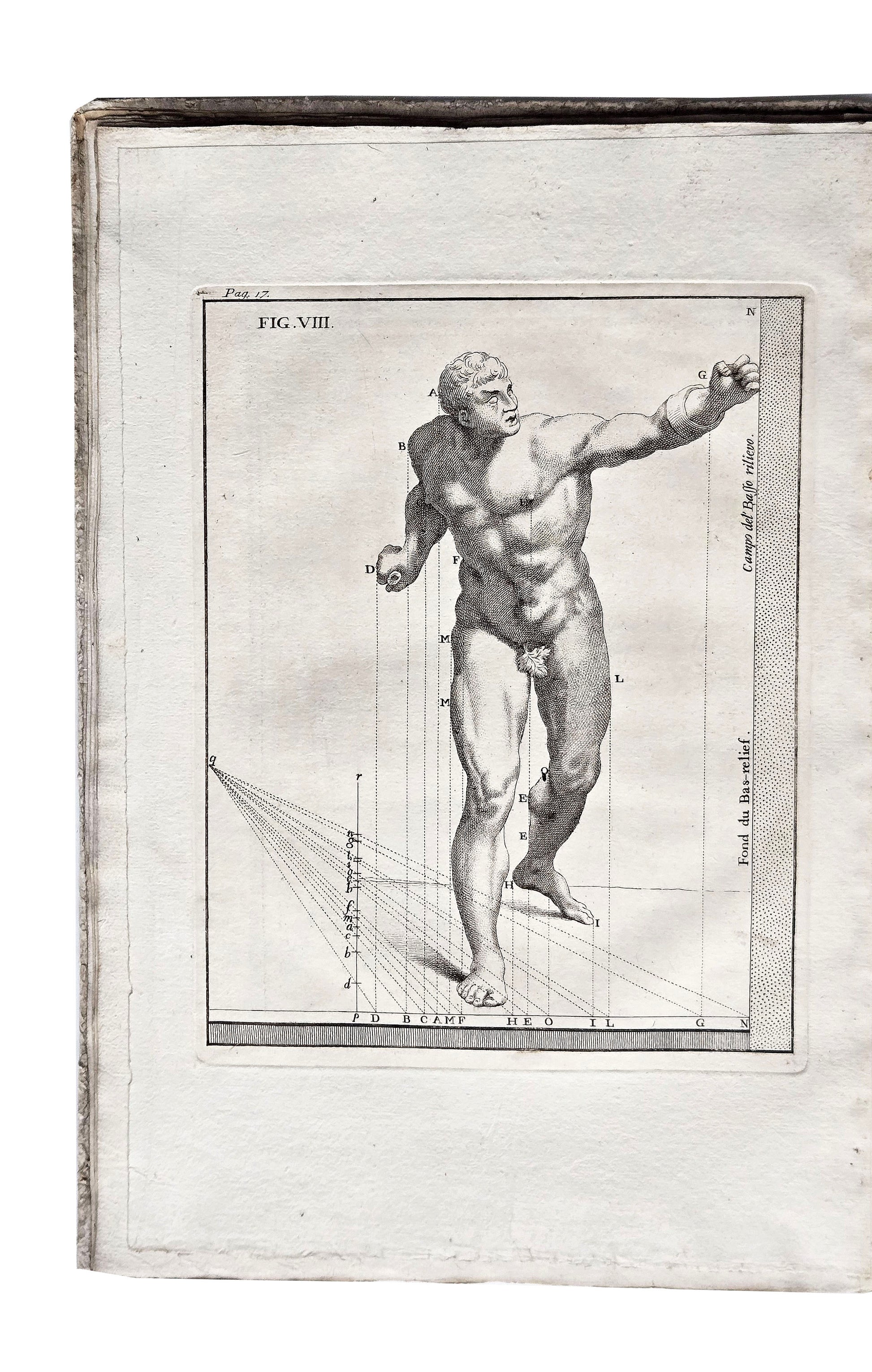 A rare work on perspective by Petitot, who was the court architect at Parma, but who is perhaps best known for his series of engravings Mascarade a la Grecqe, first published in 1771. This is an important work because of its tendency towards neoclassical simplicity and the influence it was to have on the pupils he taught at the Academy of Fine Arts in Parma. Text in both French and Italian. Spine with wear and some loss, overall a very good unsophisticated copy preserved in its first binding.