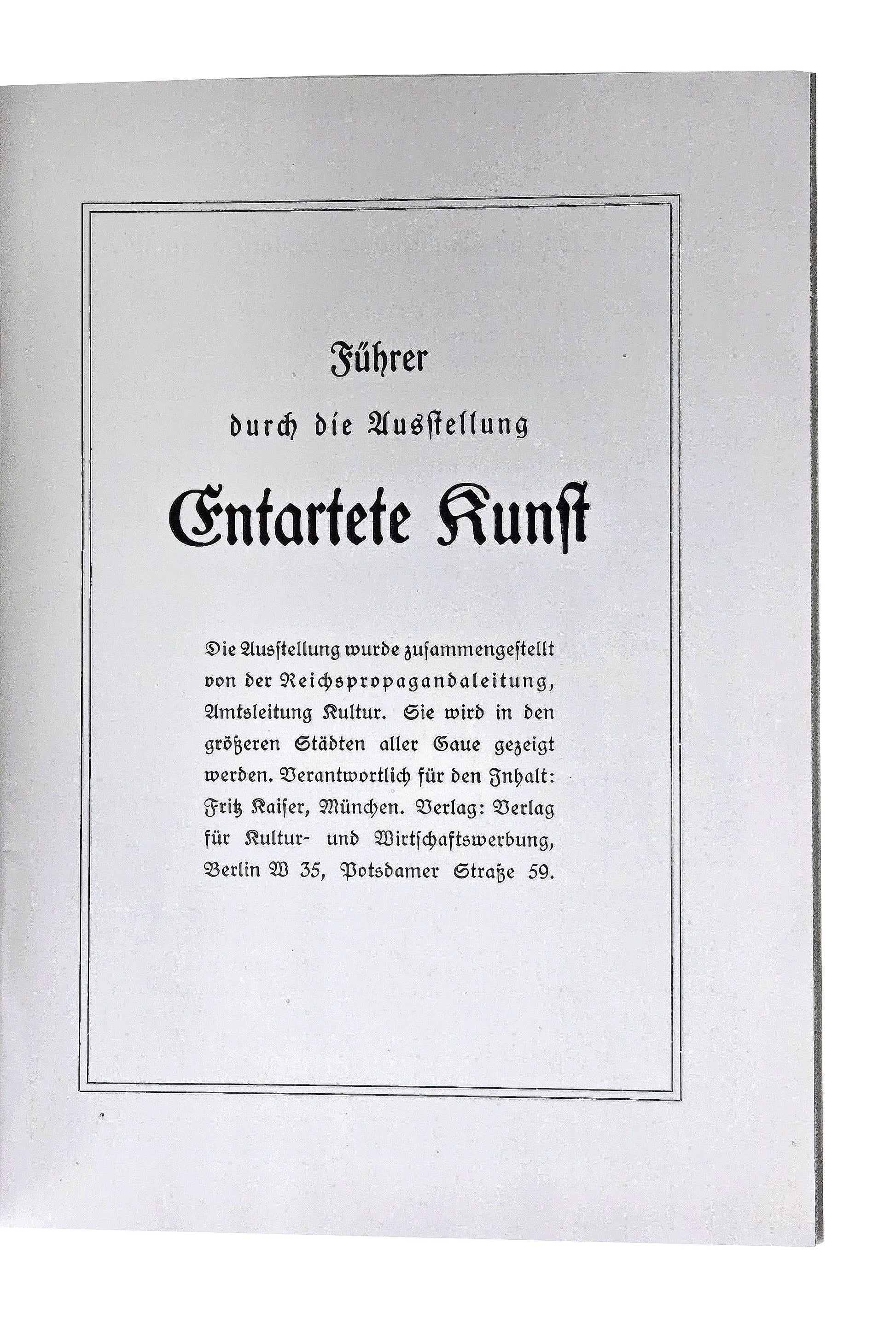 Fuehrer durch die Ausstellung. Entartete Kunst. 32 pp. Illustrated throughout. 8vo, 210 x 147 mm., bound in original illustrated wrappers. Berlin: Verlag fur Kultur- und Wirtschaftswerbung, 1937.