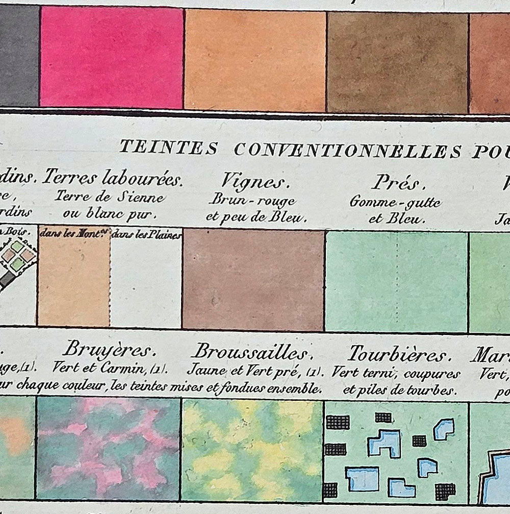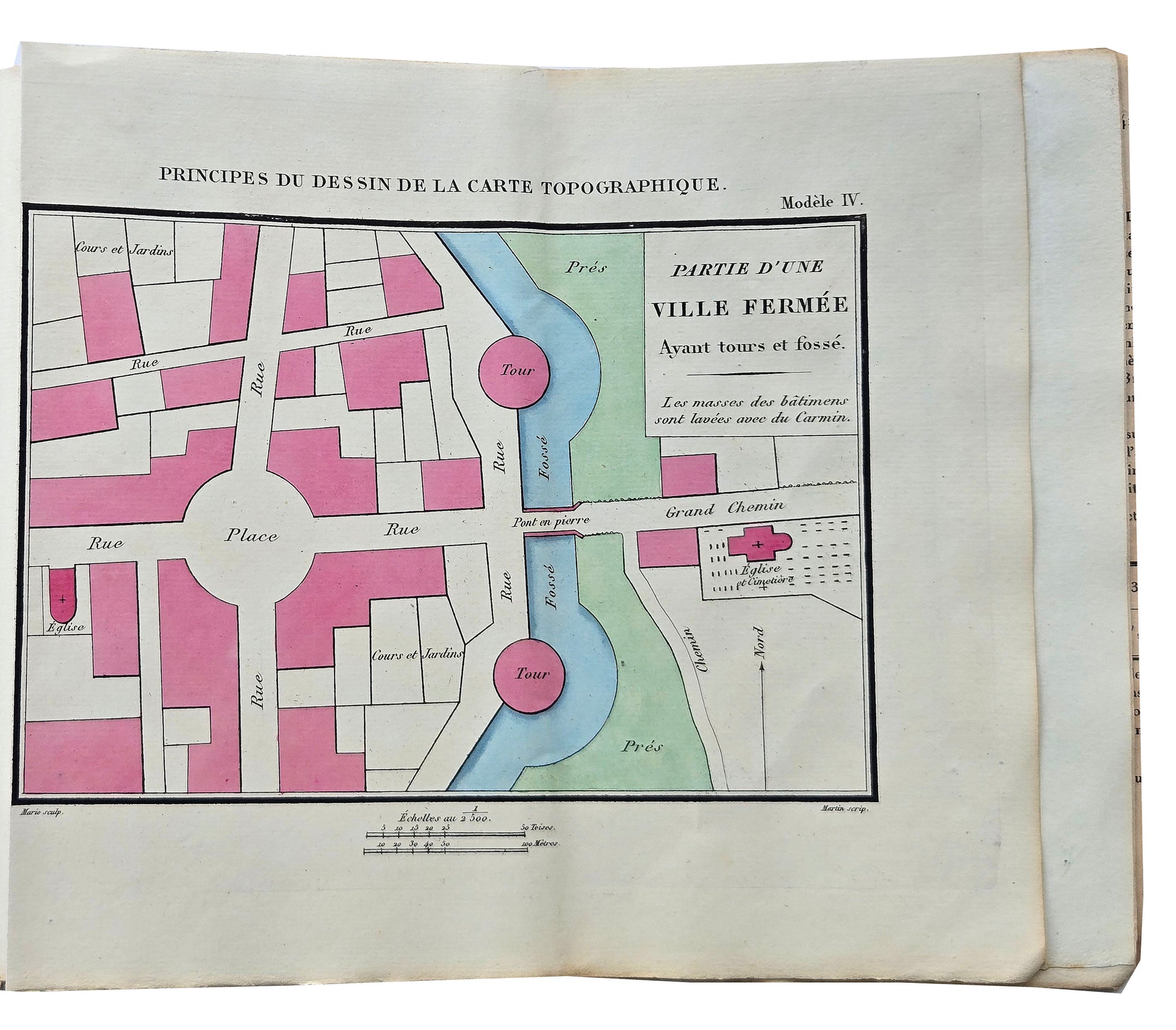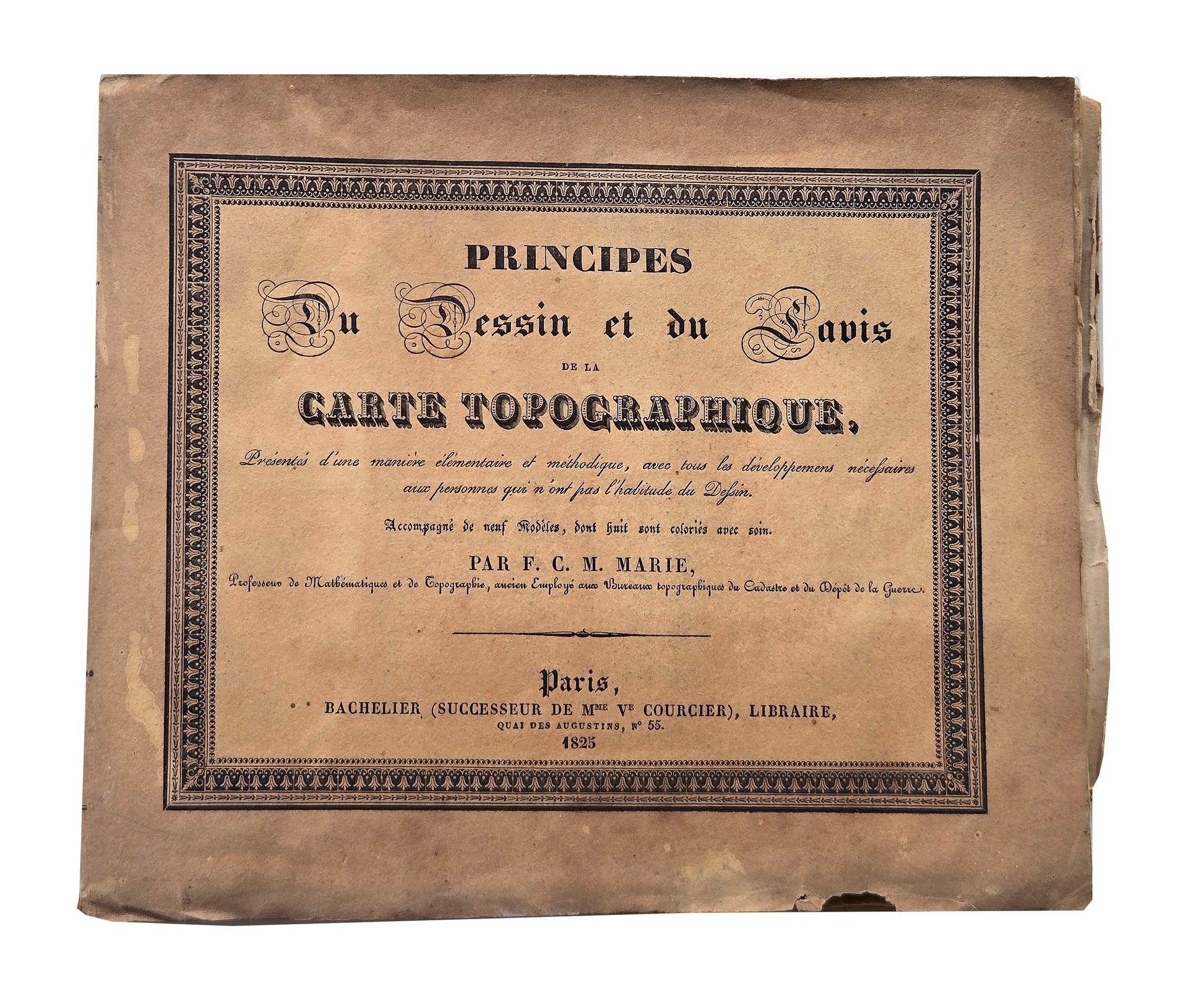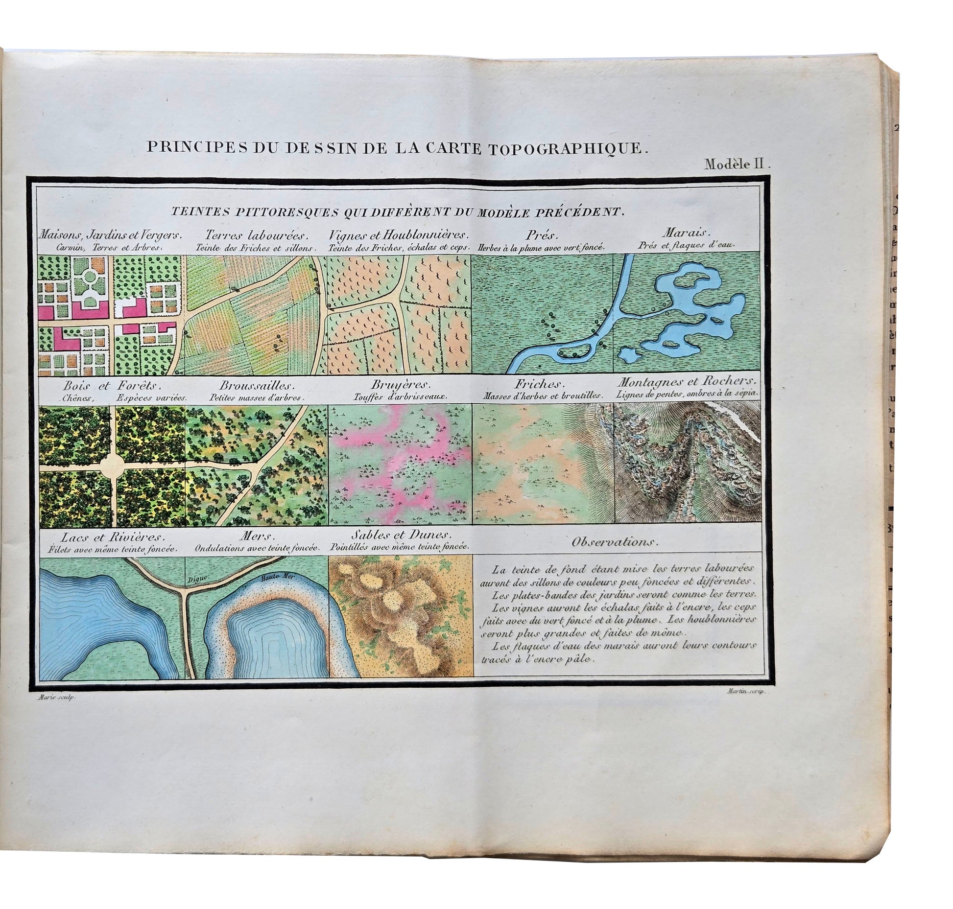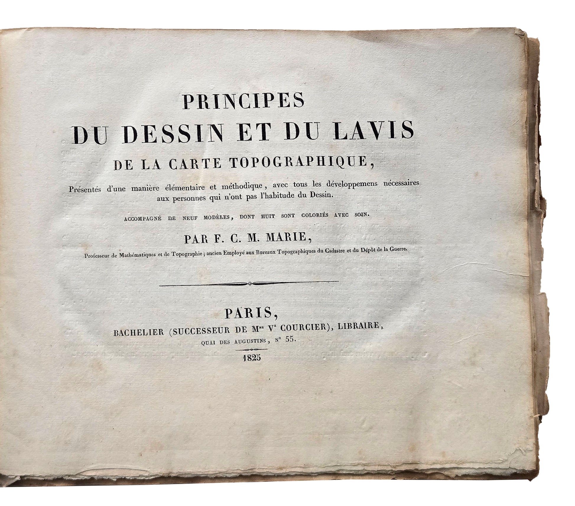 Principes du Dessin et du Lavis de la Carte Topographique. viii, 92 pp. With 3 fold-out tables. Illustrated with 9 fold-out engraved plates 8 of which are coloured by hand. Oblong folio, 225 x 265 mm, bound in publisher’s printed wrappers. Paris: Baschelier, 1825.