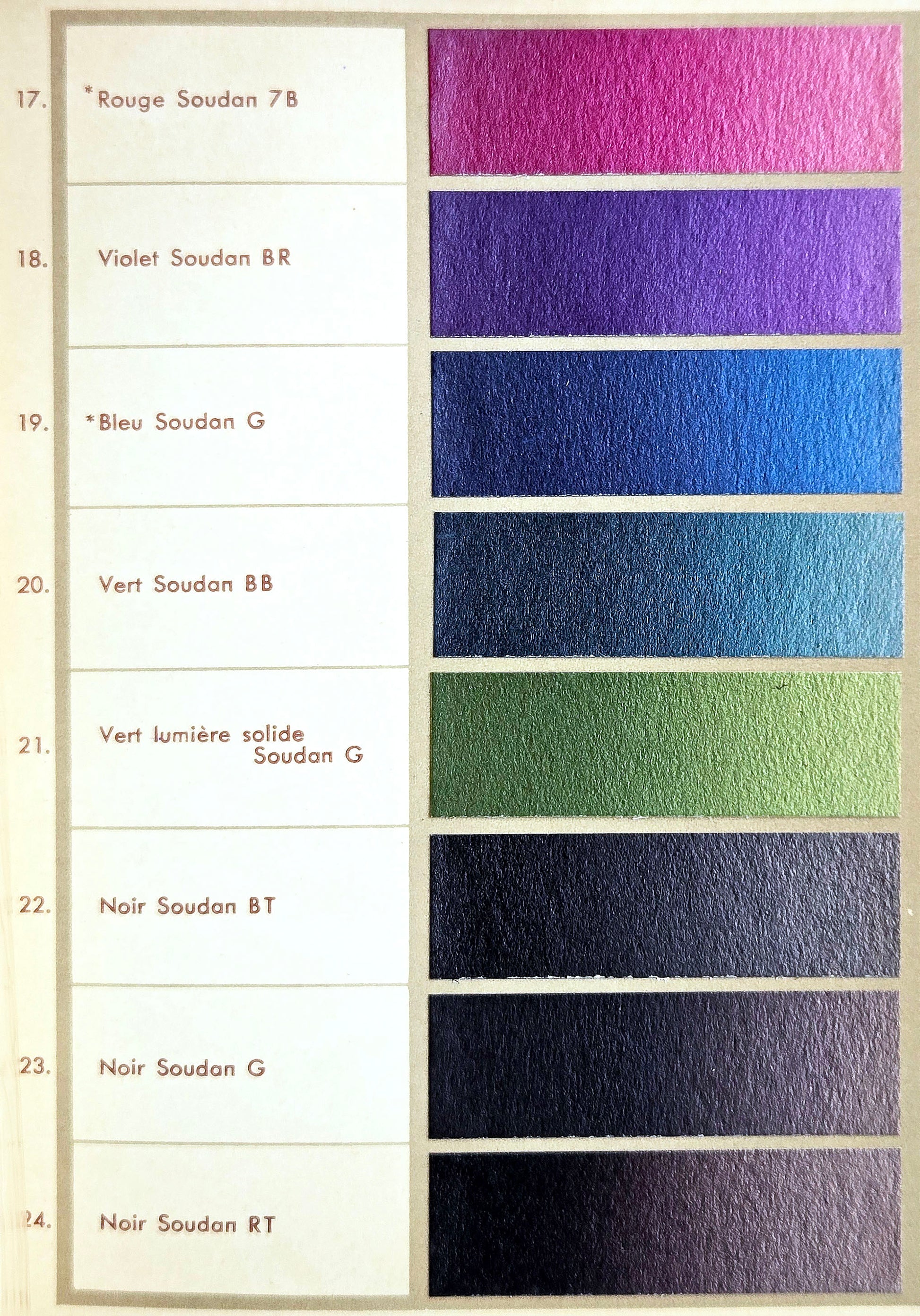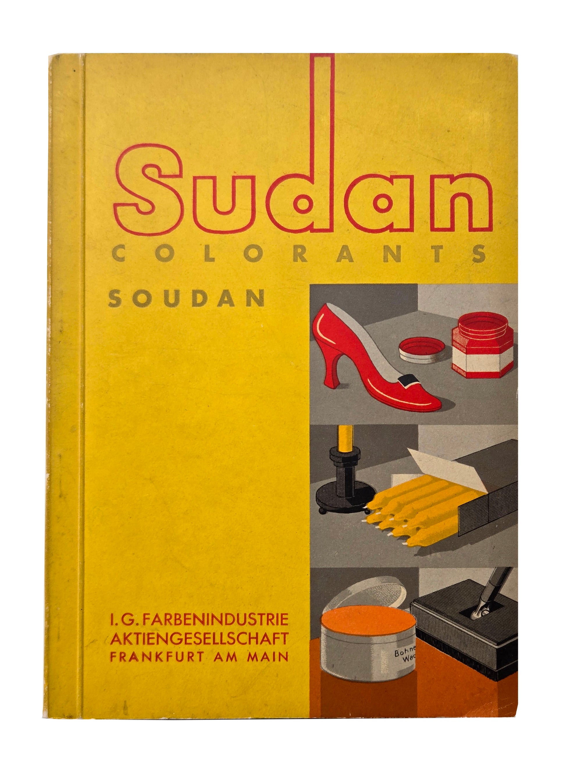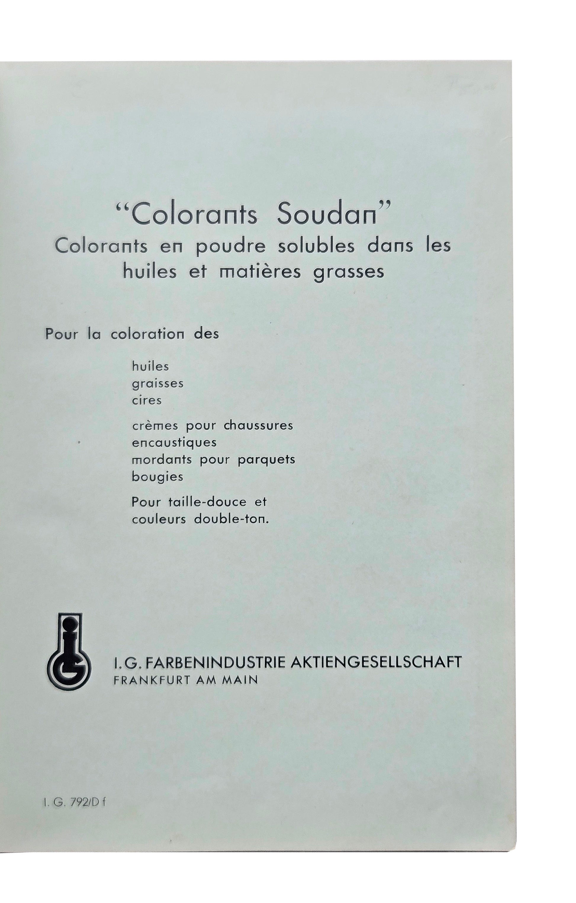 “Colorants Soudan” Colorants en poudrer solubles dans les huiles et matières grasses… 8 pp. Illustrated with 32 individual samples tipped on to four cards with acetate tissue guards. 8vo., 210 x 150 mm, bound in publisher’s illustrated boards. Franfurt Am Main: I.G. Farbenindustrie Aktiengesellschaft, nd [ca. 1926].
