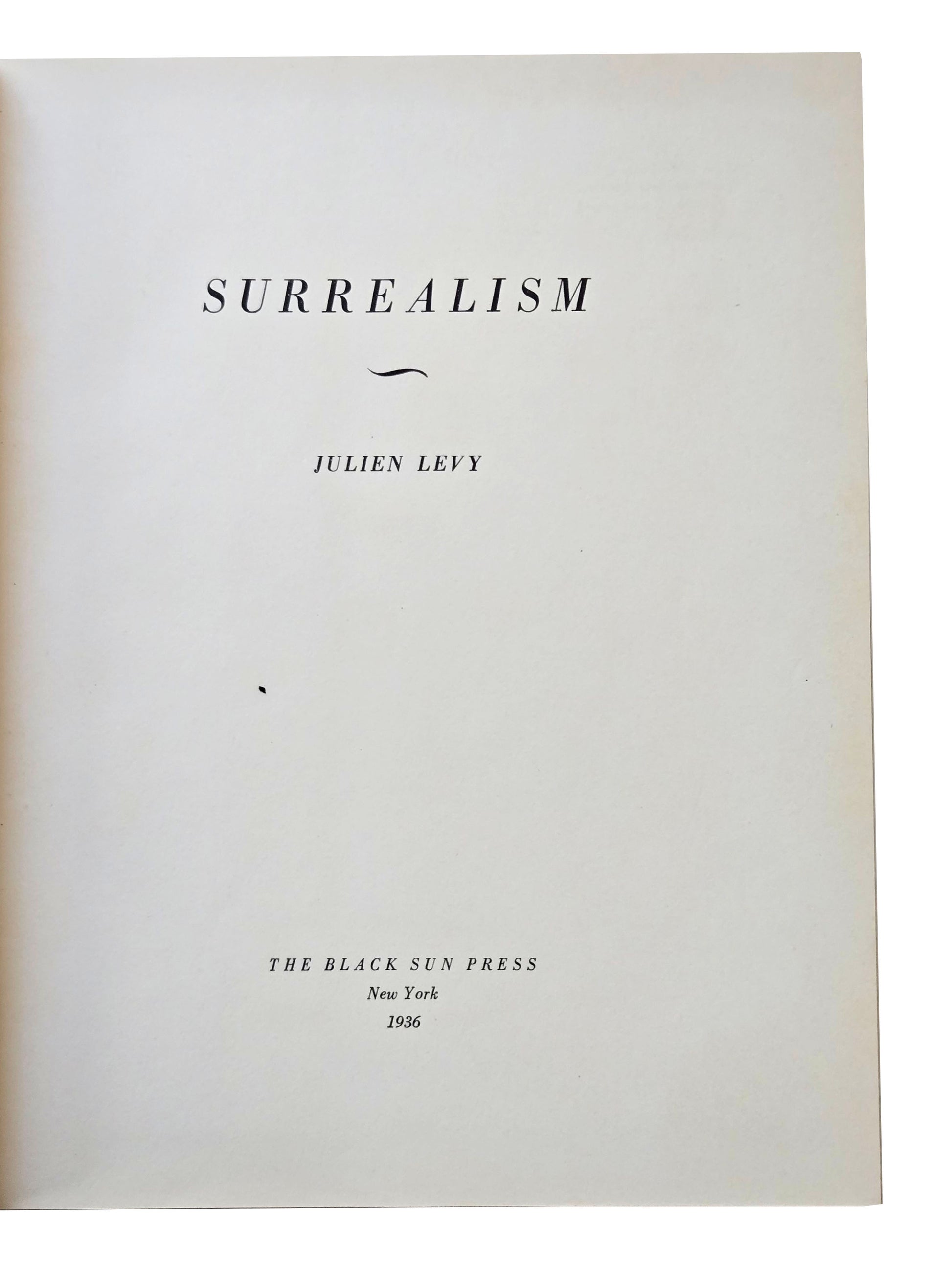Surrealism. By Julien Levy. [4], 192 pp. Illustrated throughout with photographs and reproductions. 4to., 250 x 200 mm, bound in publisher’s illustrated cloth and matching dust-jacket designed by Joseph Cornell. New York: Black Sun Press, 1936.